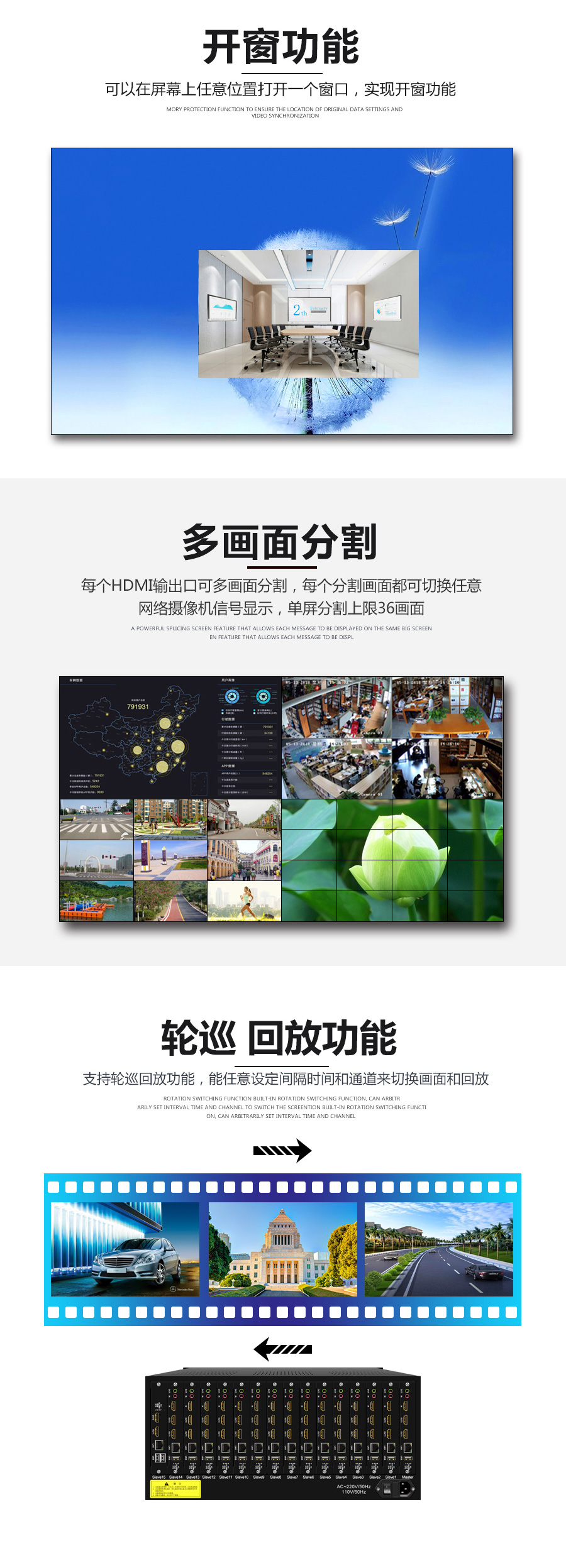 產(chǎn)品用途:搭配拼接屏使用,有解碼、拼接、分割、開窗、漫游等功能